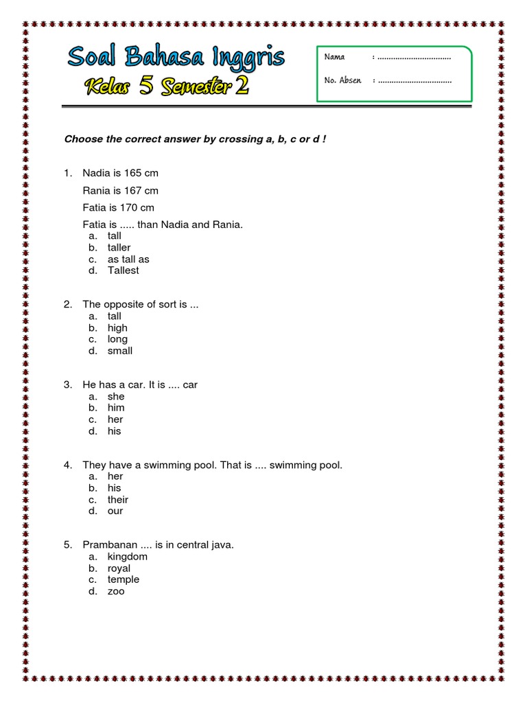 Soal-soal Bahasa Inggris di Kelas 4 Semester 2 merupakan batu loncatan penting dalam perjalanan belajar bahasa asing. Dengan memahami berbagai jenis soal, materi yang diujikan, dan menerapkan strategi belajar yang efektif, siswa dapat menghadapi tantangan ini dengan percaya diri. Kunci utamanya adalah konsistensi, praktik yang teratur, dan kemauan untuk terus belajar. Melalui kombinasi pengajaran yang baik di sekolah dan dukungan yang optimal di rumah, siswa kelas 4 dapat terus berkembang dan menjelajahi dunia bahasa Inggris dengan lebih luas dan menyenangkan.